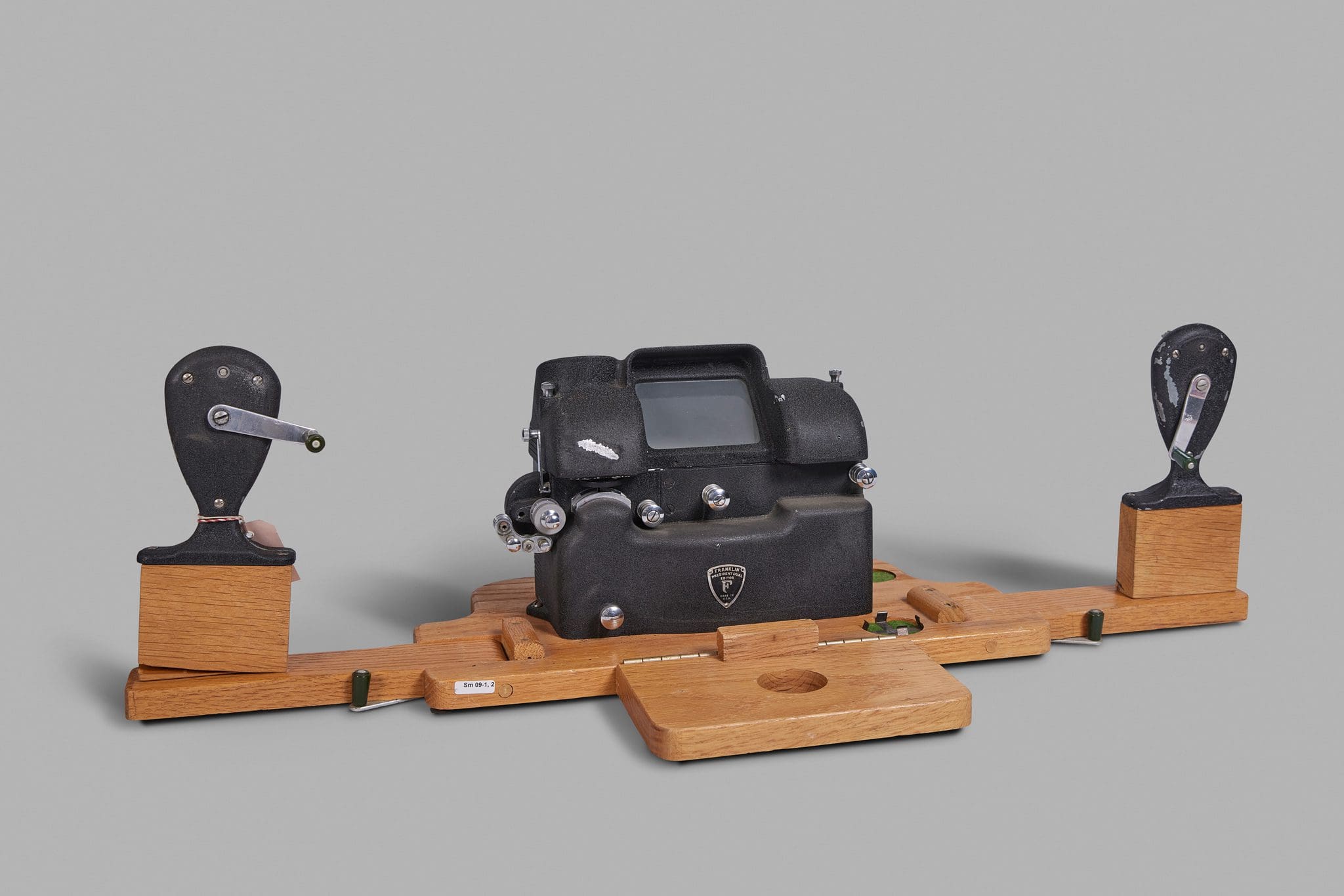 Franklin, President Dual skoðari fyrir 16 mm filmur. Tréverk hefur verið smíðað utan um skoðarann.